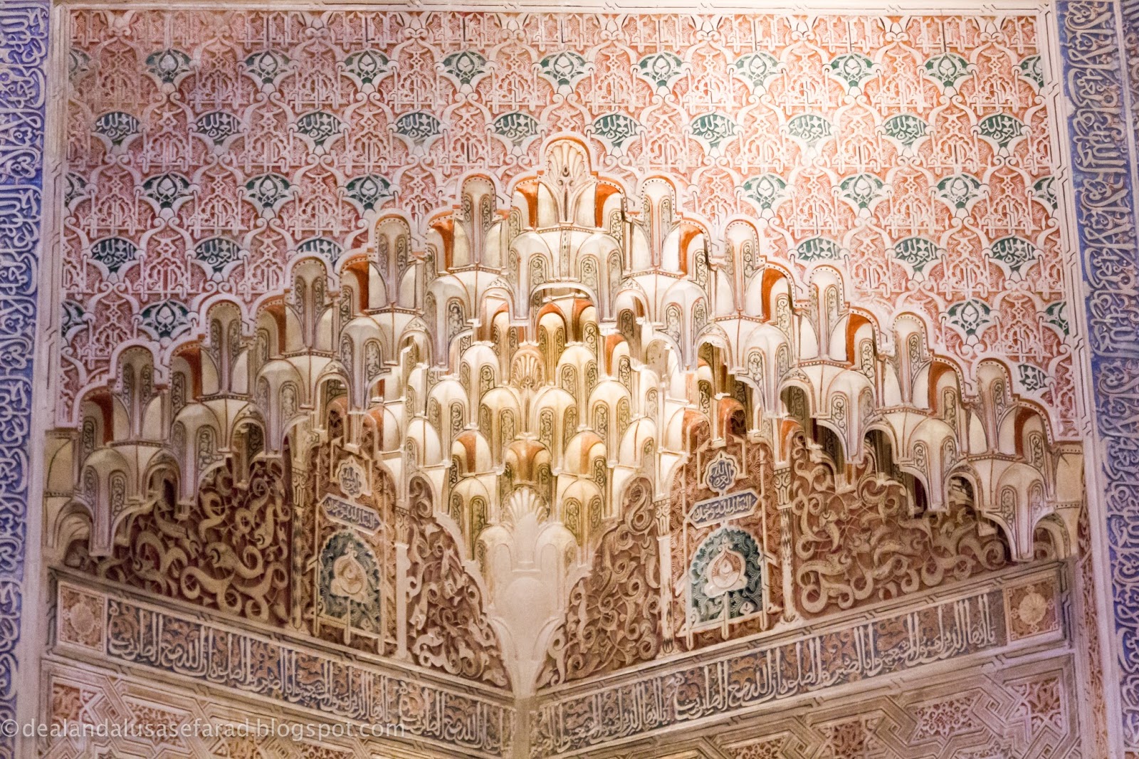 | trabajo de yesería nazarí, conserva los colores originales, realizado en tiempo de Yusuf I |