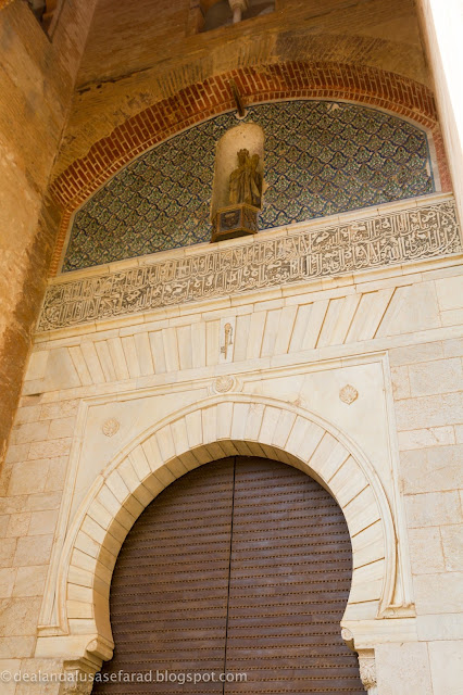 La fachada grande esta compuesta por un gran arco de herradura en fabrica de ladrillo y nos llamó la atención, que en la dovela clave se muestra la mano de Fatima o Hamza. Es un símbolo de protección, de paz, de bienvenida, simboliza los cinco pilares del Islam, si bien, los expertos aún no han ofrecido una explicación científica a esta decoración.